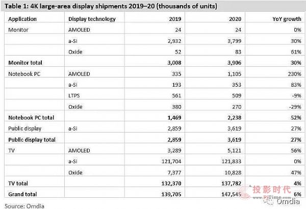 4K笔记本液晶面板增长将保持持平,2019年出货量为110万片,2020年仍将为110万片。其中包括非晶硅、低温多晶硅和金属氧化物技术产品。2020年非晶硅 4K 笔记本液晶面板将大幅增长,同比增长83%,但低温多晶硅和金属氧化物4K面板将有所下降。这是因为低温多晶硅面板的成本和价格相对较高,即使有较低的功耗和超薄边框的特点。新冠疫情的爆发刺激了笔记本电脑的需求,但更多的是刺激了商用市场方面的需求;但是商用市场并不需要高价的4K 低温多晶硅面板。另一方面,夏普因为成本高、笔记本电脑面板市场竞争激烈,已经淘汰了很多氧化物4K笔记本电脑面板型号;因此,氧化物4K笔记本电脑面板出货量将在2020年有所下降。