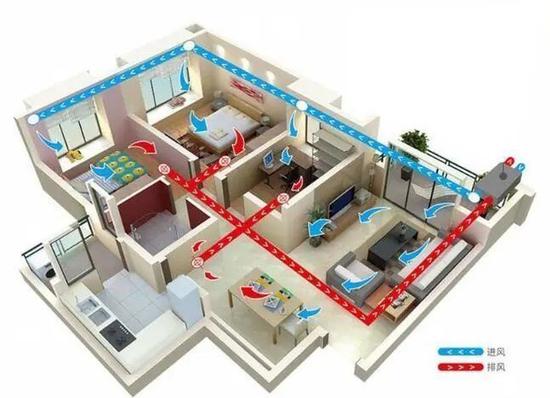 新风系统,就是模拟开创通风的效果。通过引入室外经新风机空气过滤后进入室内,制造室内外的细微的气压差,让室内的污染空气通过门缝、窗缝等位置排除。这个过程一直持续不断,确保的室内外空气的持续交换。