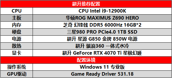 Inteli9-12900K的CPU搭配华硕ROG MAXIMUS Z690 HERO主板能很好地发挥耕升GeForce RTX 4070 Ti星极幻姬的性能,并且搭配芝奇 幻锋戟 DDR5 6000Hz 32GB内存和三星980 PRO PCIe4.0 1TB SSD能提供很好的硬盘读取速度和软件运行速度。耕升星源 G850金牌850W电源与耕升骇浪360一体式水冷能为显卡高性能供电及降温,为显卡动力输出提供持续保障。