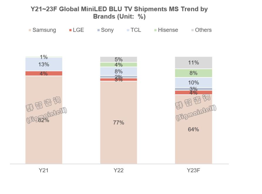 TCL则多年持续以MiniLED背光+超大尺寸打造高端产品线,2023年在背光方案方面持续升级,将500分区以下背光方案向1000分区靠拢,提升产品性能,对标其他品牌高端产品。根据群智咨询(Sigmaintell)研究数据,预计2023年全球MiniLED背光电视市场出货规模将接近40万台,